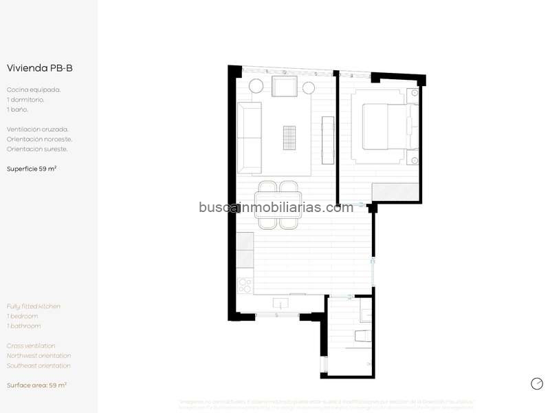 Entre2 Servicios Inmobiliarios presenta esta vivienda de 59 m2, ubicada en una finca con ascensor, diseñada con una distribución interior optimizada y doble orientación noroeste–sureste, manteniendo la coherencia estética y funcional del conjunto de la promoción.