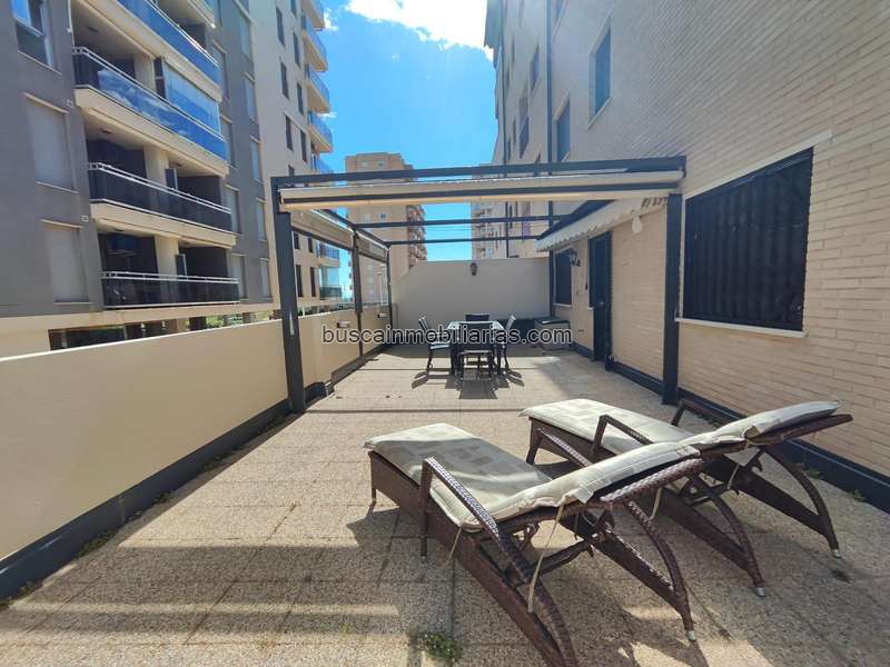La cocina independiente, totalmente equipada, también tiene acceso directo a la terraza, que cuenta con toldos, estructura de palillería de aluminio inoxidable, iluminación integrada, y espectaculares vistas al mar y la montaña. Su orientación noroeste te permite disfrutar de las mejores puestas de sol. Además, dispone de toma de agua, ideal para instalar una zona de lavado o plantas.
