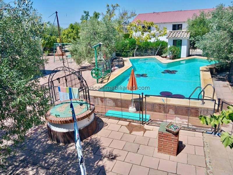 La parcela dispone de un inmueble con 209 m2, que comprende una vivienda centenaria (en buen estado) con salón (con chimenea), dos dormitorios, cocina, baño, patio empedrado y azotea; comunicada con una vivienda actual de tres amplias habitaciones, un gran cuarto de baño y una cocina amplia. Delante de la casa nos encontramos con dos porches entoldados. Dispone de caldera de gas para agua caliente y calefacción en las habitaciones; así como de una gran piscina vallada, caseta para la depuradora y un palomar (para uso de almacén), el suelo exterior de toda la zona de la casa y la piscina se encuentra enlosado.
