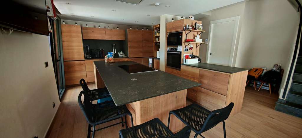 Otros: Mobiliario de cocina de madera de roble natural y electrodomésticos Bosch.