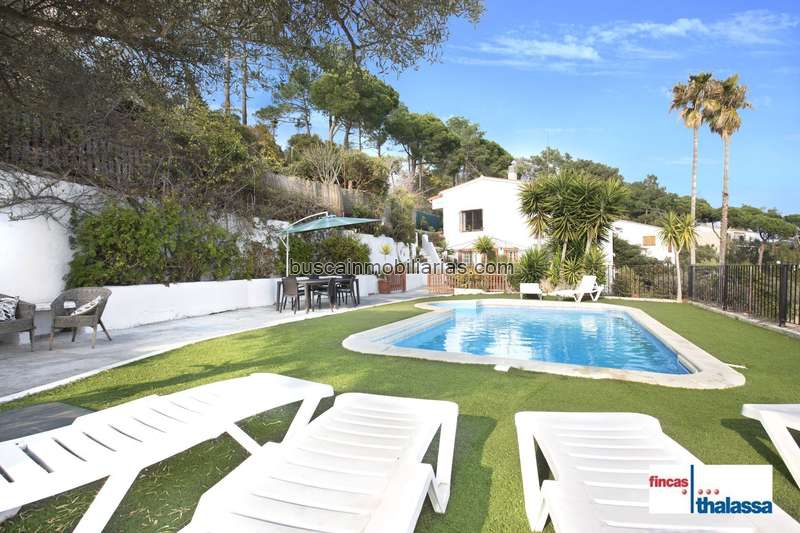 FINCAS THALASSA vende casa con piscina privada y vistas al mar situada en una zona residencial muy tranquila a tan sólo 3 km de la bonita playa de Canyelles, a 5 km del centro de Lloret de Mar y a 7 km de Tossa de Mar, uno de los pueblos con más encanto de la Costa Brava. ¡Esta casa es ideal para disfrutar de unas vacaciones en familia en la Costa Brava! Villa Palmeras es una casa divida en 2 plantas con entrada independiente en cada una de ellas, con una capacidad máxima para 10 personas. Zona exterior con piscina privada (7x3.5m) con maravillosas vistas al mar y montaña, barbacoa de obra, y una amplia terraza donde disfrutar de desayunos y comidas en familia, así como una zona chill out para relajarse y disfrutar de las vistas. El apartamento en la planta baja consta de un salón comedor, cocina equipada, 1 habitación de matrimonio, 1 habitación doble y 1 baño con ducha. El apartamento en la 1era planta, tiene un gran salón comedor abierto a una cocina, 2 habitaciones de matrimonio (una suite), 1 habitación con literas y 1 baño con bañera. Pequeña estancia fuera de la casa con lavadora.