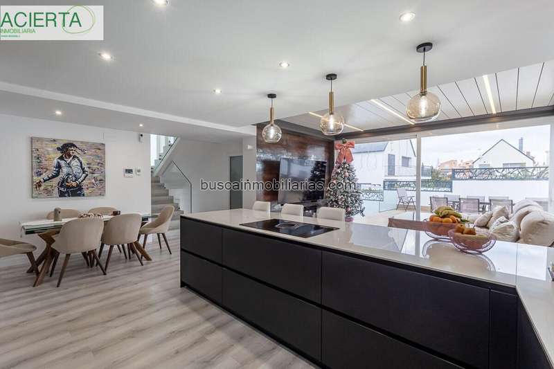 La planta principal ofrece un espectacular salón-comedor abierto a la terraza, con grandes ventanales que inundan la vivienda de luz natural y crean una agradable conexión interior–exterior. La cocina integrada, con isla central, encimeras blancas y mobiliario en negro mate, está totalmente equipada y pensada para disfrutar tanto en familia como con invitados.