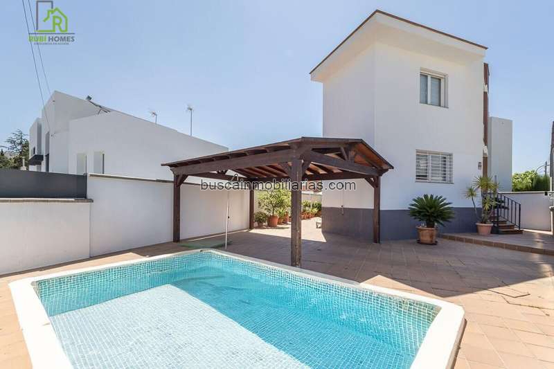 El jardín es muy versátil y ofrece la posibilidad de disfrutar de los distintos ambientes que puedes crear, desde la zona de la piscina, con una gran pérgola para resguardarte del sol en los calurosos veranos, hasta una zona de comedor junto a la cocina. Además podrás utilizar la pérgola del patio como garaje en superficie.