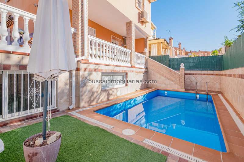 - Primera planta: Un aseo, amplia cocina y un luminoso salón con dos salidas a una amplia terraza que rodea prácticamente toda la vivienda, perfecta para disfrutar del sol y el aire libre desde la que se accede directamente a la piscina.