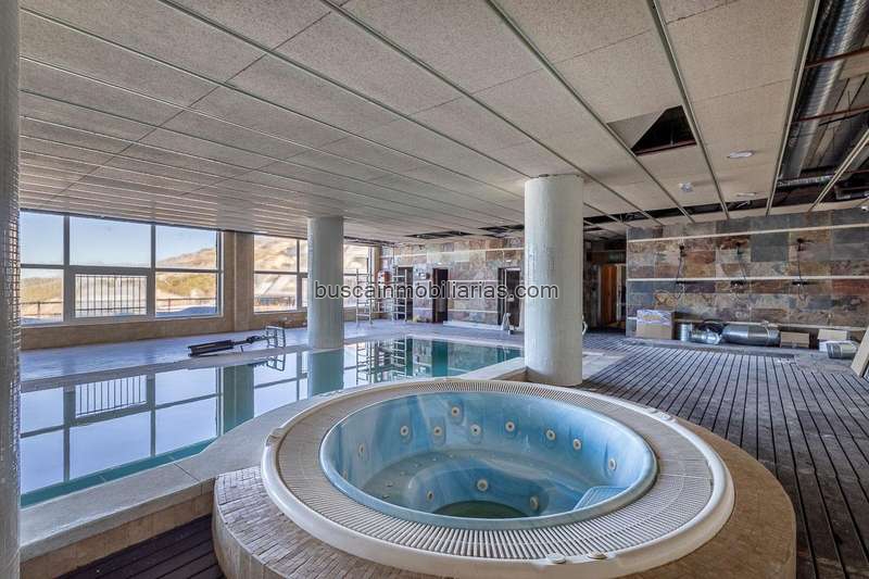 Espectacular área wellness con gran piscina cubierta climatizada, jacuzzi y zona de descanso, perfecta para relajarse después de una jornada en las pistas.