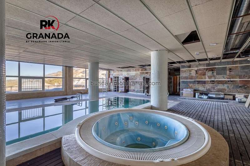 Espectacular área wellness con gran piscina cubierta climatizada, jacuzzi y zona de descanso, perfecta para relajarse después de una jornada en las pistas.