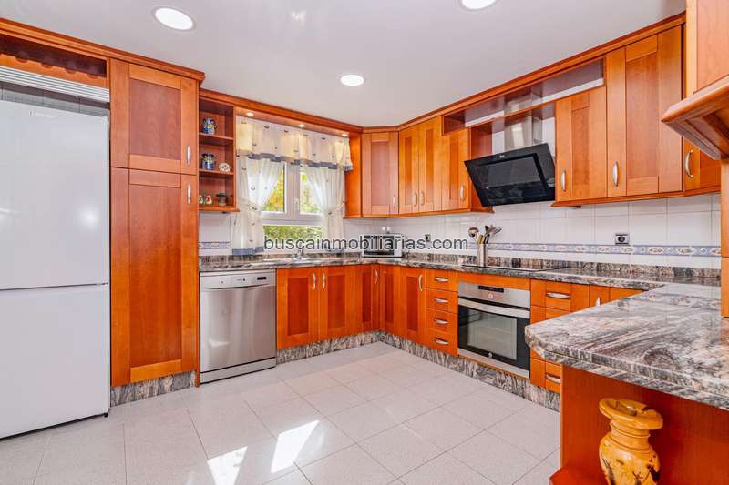 Entramos desde la calle a un bonito porche y en la planta baja encontramos una cocina muy amplia amueblada y equipada con electrodomésticos, salón y cuarto de baño con plato de ducha.