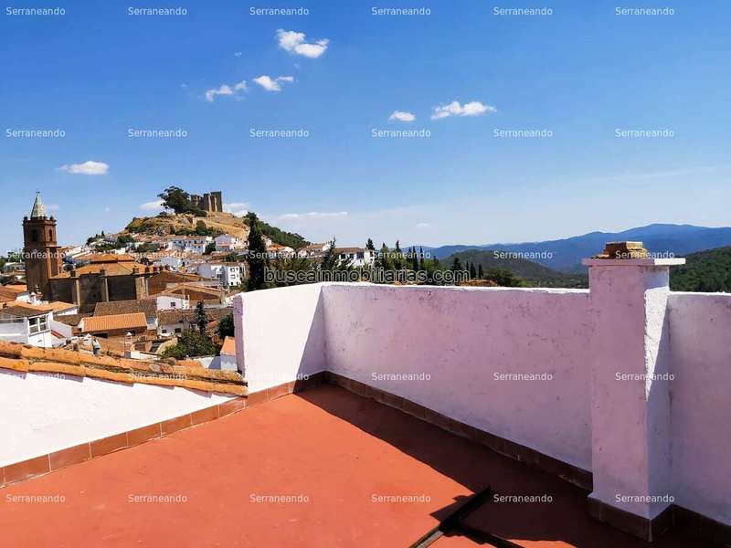 La primera planta, de 75 m², requiere reformas y se distribuye en dos salones, cocina independiente con despensa, tres dormitorios, un baño para renovar y una estancia diáfana ideal como trastero, además de una amplia terraza con agradables vistas a la sierra y al histórico castillo de Cortegana.