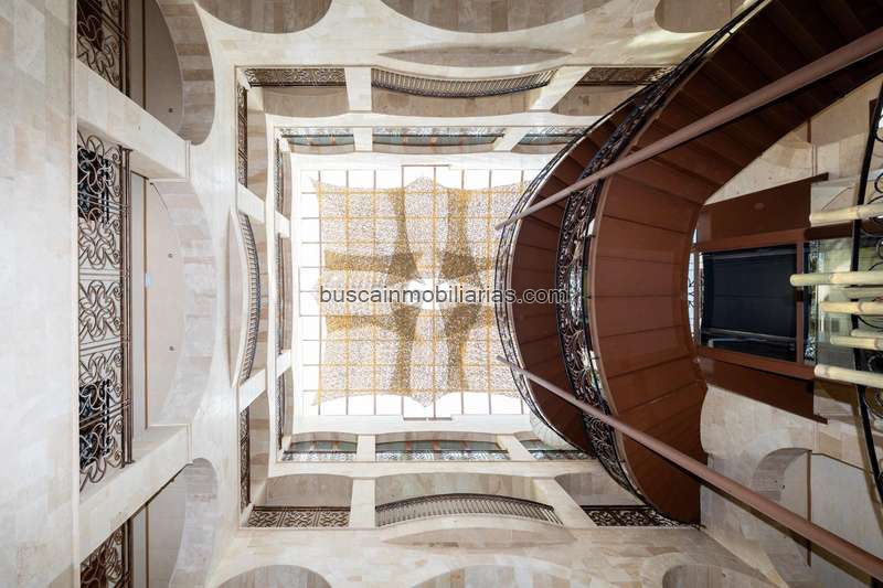 La escalera de líneas curvas, elaborada con barandales metálicos de diseño artesanal, refuerza el carácter señorial del conjunto, mientras que el ascensor panorámico de cristal, situado en el corazón del atrio, ofrece modernidad y profundidad visual. Esculturas clásicas, arcos decorativos y elementos de forja completan un espacio de inspiración palaciega que define la identidad del edificio.