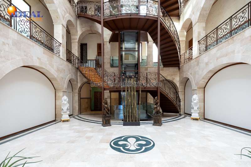La escalera de líneas curvas, acompañada por barandales metálicos trabajados de forma artística, crea un conjunto arquitectónico de gran presencia. En el centro del atrio destaca un ascensor de cristal, que aporta modernidad y amplitud visual.