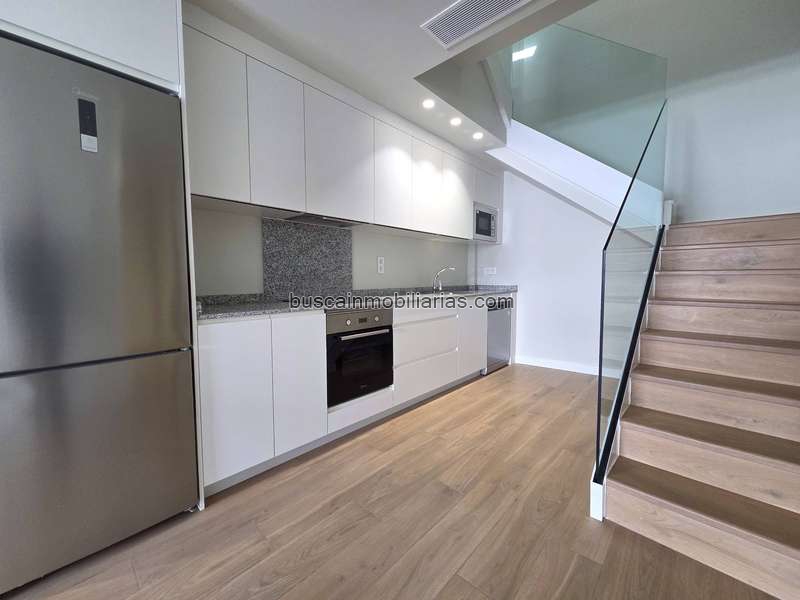 En la planta baja, el piso cuenta con un luminoso salón con cocina integrada, totalmente equipada con electrodomésticos de alta gama (vitrocerámica, horno, extractor, lavavajillas, microondas y frigorífico) y un baño con plato de ducha, lavadora-secadora y sistema de aerotermia.