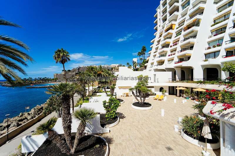 Sal al exterior y disfruta de la amplia terraza, donde las vistas panorámicas al Océano Atlántico y a los exuberantes jardines tropicales con palmeras crean una auténtica sensación de libertad. A tan solo un tramo de escaleras hacia abajo, llegarás al paseo marítimo con acceso directo a la playa, ideal para un refrescante baño o un paseo al atardecer. Y subiendo un tramo de escaleras, encontrarás la preciosa zona comunitaria de piscina, rodeada de soláriums y zonas verdes, perfecta para relajarse al sol.