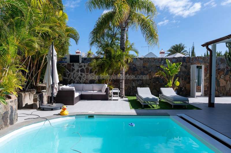 Esta exclusiva propiedad destaca por su magnífica zona exterior, concebida como un auténtico oasis privado donde relajarse y disfrutar del clima privilegiado del sur de Gran Canaria. La parcela alberga una elegante piscina climatizada, propias palmeras y una amplia terraza que recibe sol durante todo el día, creando un ambiente perfecto tanto para el descanso como para reuniones al aire libre.