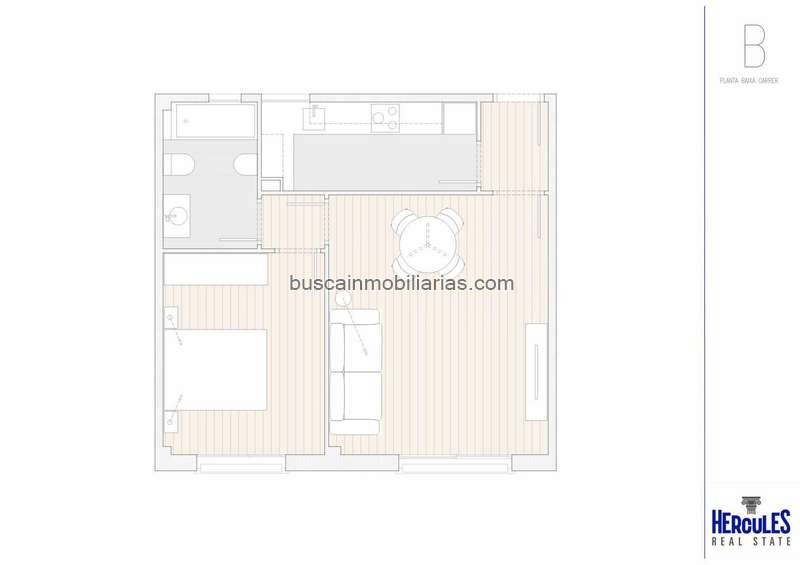 Con mobiliario moderno, encimera porcelánica, placa vitrocerámica, horno y campana integrada.