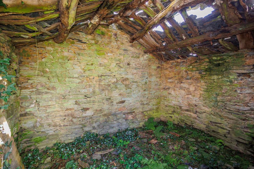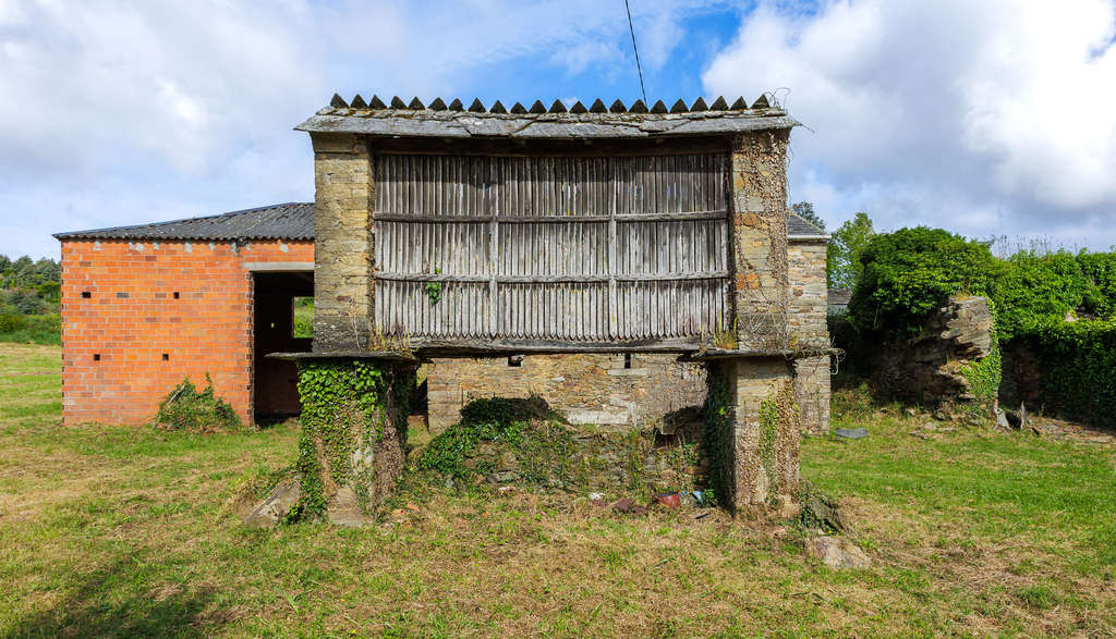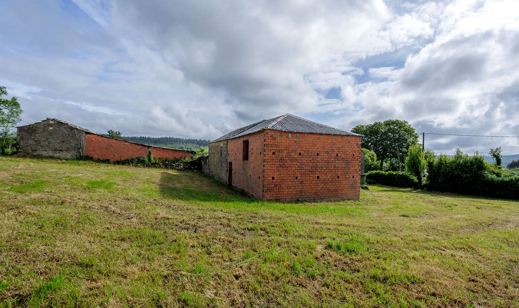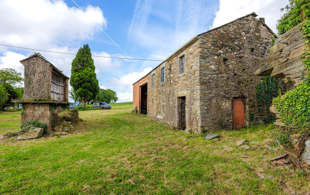 Adosado a la casa principal se encuentra un amplio alpendre de ladrillo que ofrece un espacio cubierto de grandes dimensiones. El conjunto se completa con un hórreo gallego tradicional bien conservado, con sus características columnas de piedra y estructura elevada. Junto a la casa se extiende una parcela de más de 1.700 m² de terreno edificable, soleada durante todo el día.