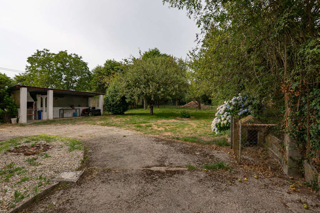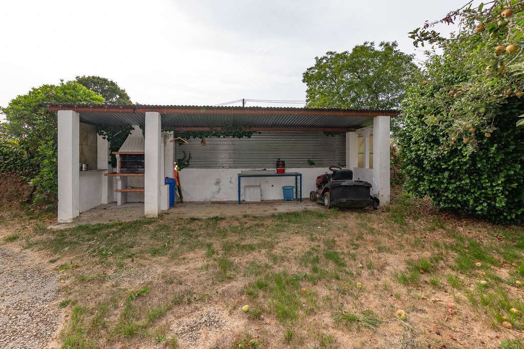 Los exteriores incluyen zona pavimentada para vehículos y jardín delantero con árboles. La parte trasera incluye árboles frutales, un pozo de agua, una zona de barbacoa cubierta y un alpendre doble.
