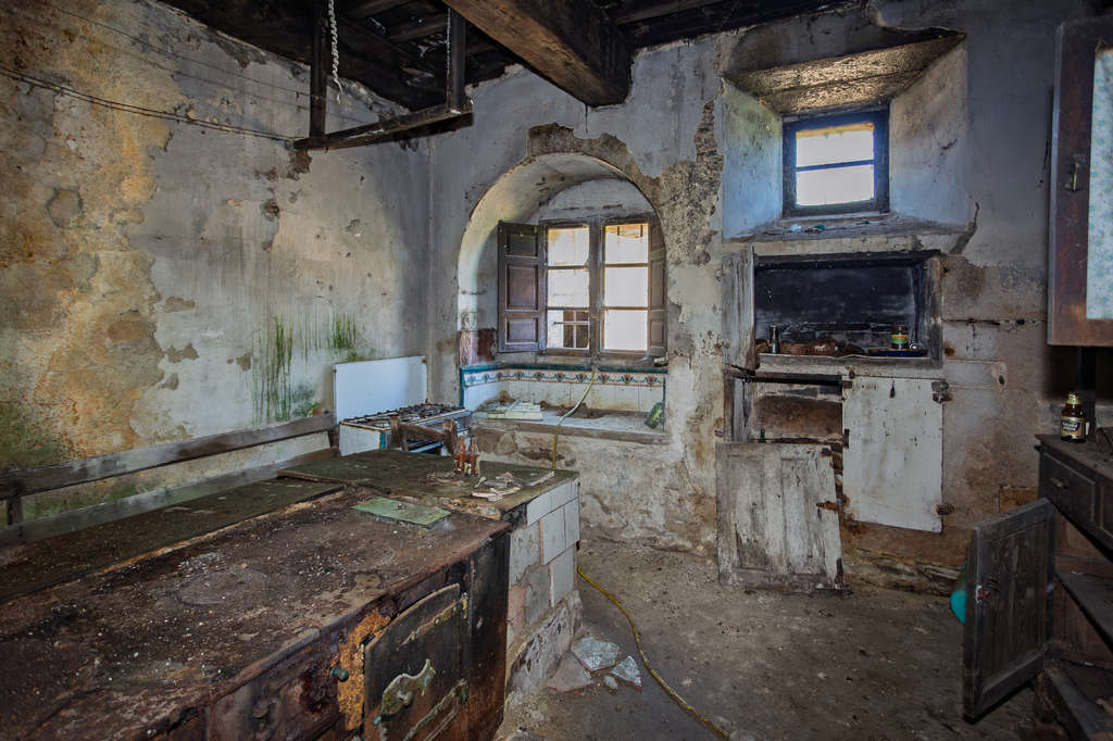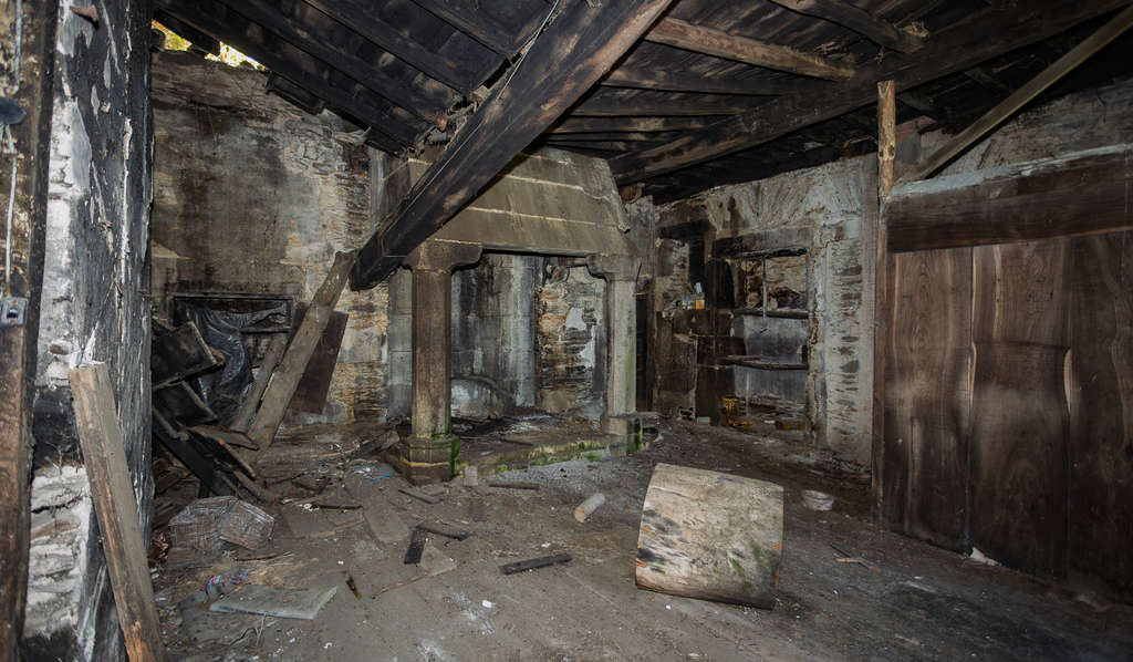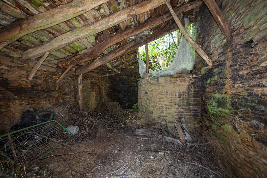 El conjunto se completa con un gran alpendre que alberga un horno de leña tradicional, del cual emerge otra imponente chimenea.