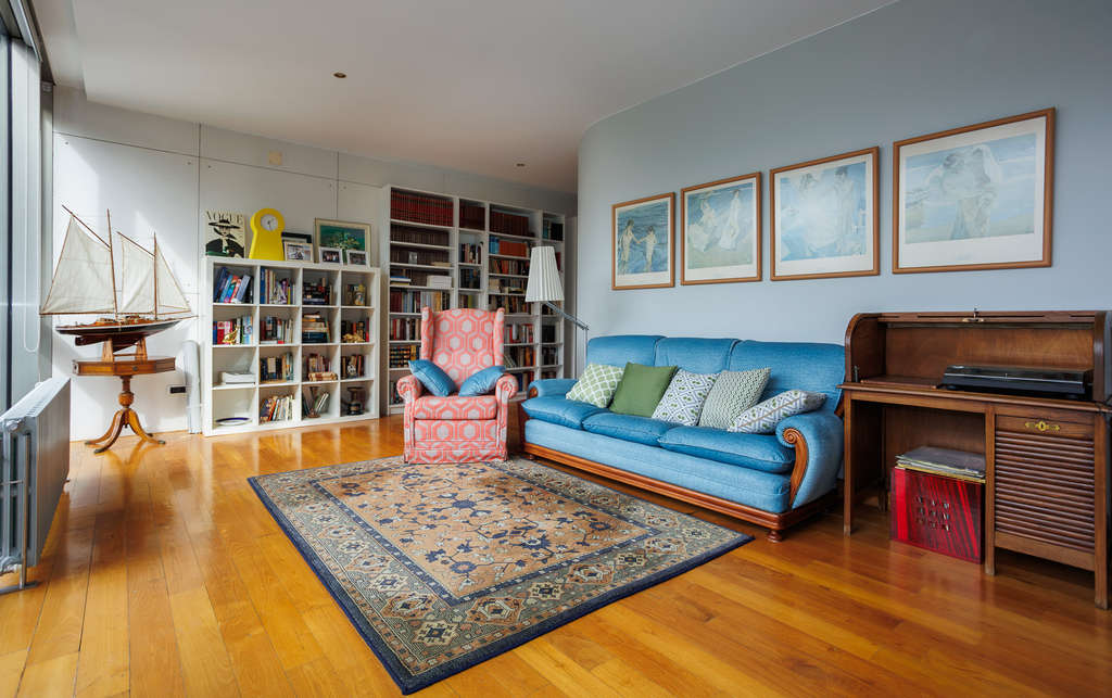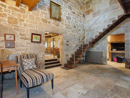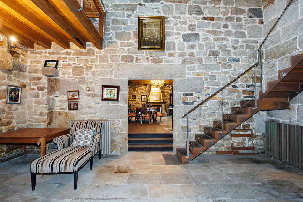 El molino restaurado conserva muros de piedra y vigas de madera vista, con espacios en dos plantas que incluyen comedor con chimenea. Además incluye gimnasio y varias zonas de garaje.