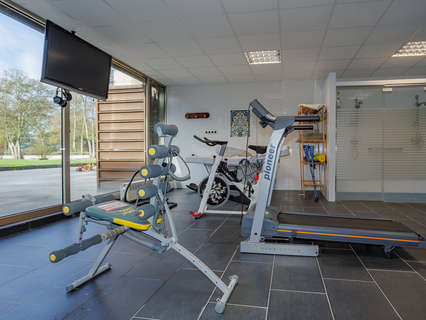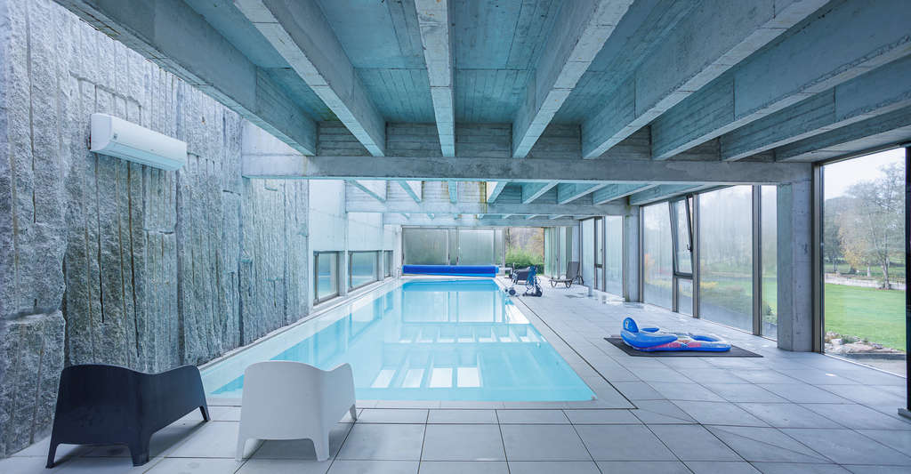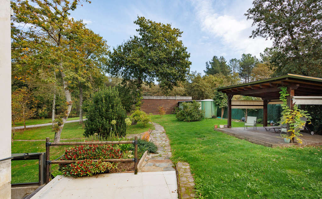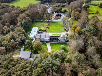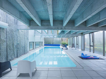 Una construcción anexa alberga piscina climatizada de agua salada, sauna y jacuzzi, con grandes ventanales y acabados en piedra natural. Los exteriores incluyen jardines, huertos, invernaderos y zonas para animales.