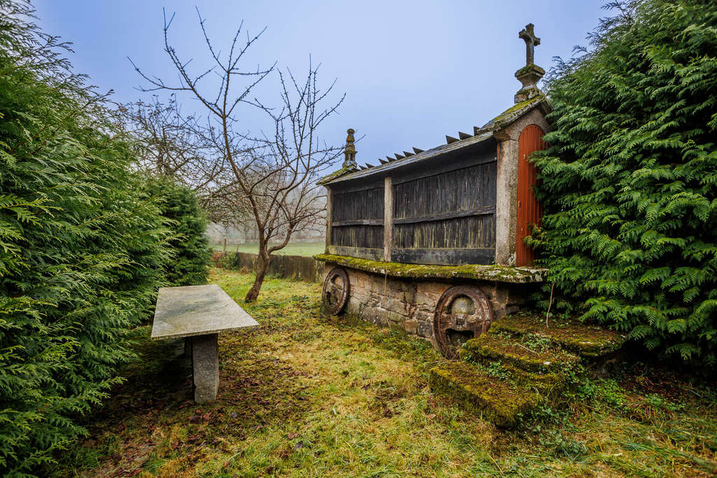 La finca trasera, compartida por ambas casas, es completamente llana e incluye varios árboles frutales, un hórreo tradicional gallego y una gran mesa de piedra. A 200 metros se encuentra un área recreativa fluvial para el baño estival.
