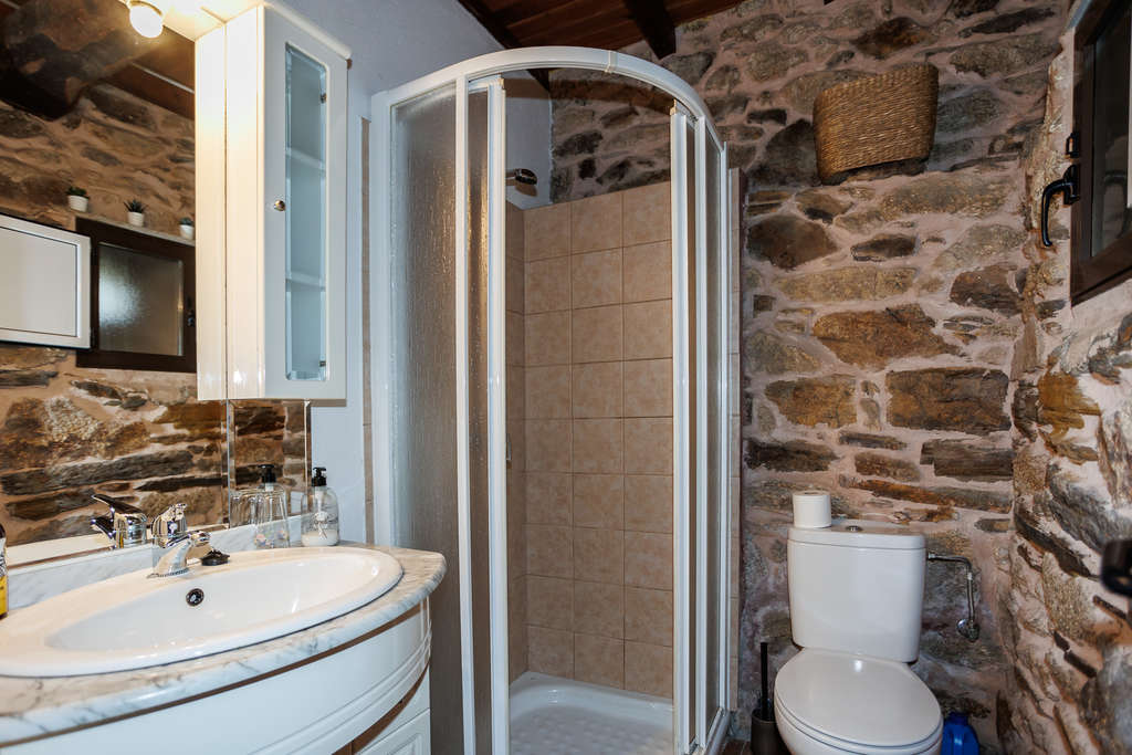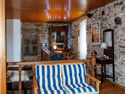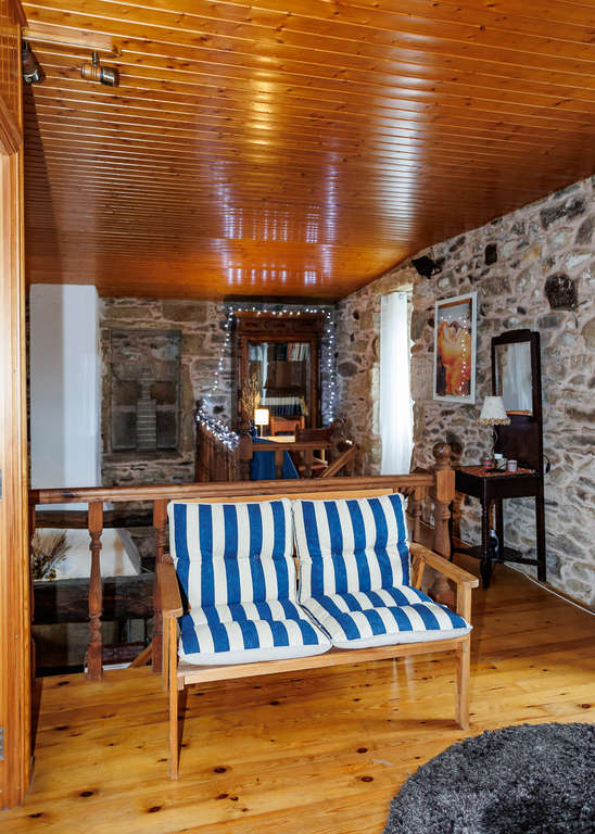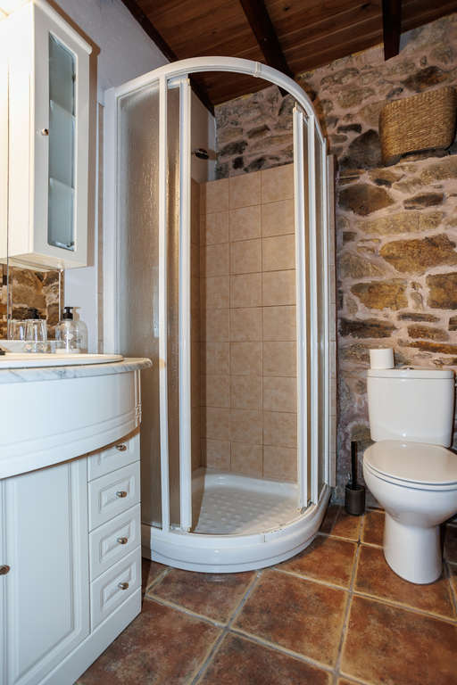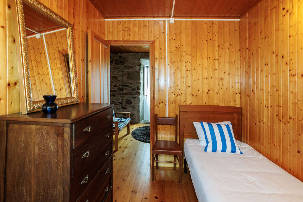La casa principal de piedra está completamente restaurada y distribuida en dos plantas. La planta baja incluye cocina-salón-comedor con lareira tradicional, pila original de piedra y cuarto de baño. La planta superior alberga una salita con librería y tres habitaciones con suelos y techos de madera.