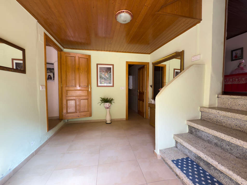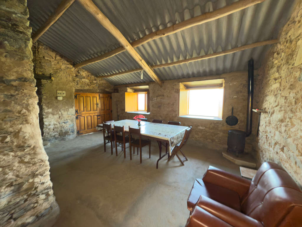 Esta vivienda principal incluye un hall de entrada que distribuye hacia una cocina con lareira tradicional y zona moderna, un salón-comedor de 21 m² con techo de madera, dos dormitorios de diferentes dimensiones y un cuarto de baño completo. El hall superior se utiliza actualmente como dormitorio adicional.