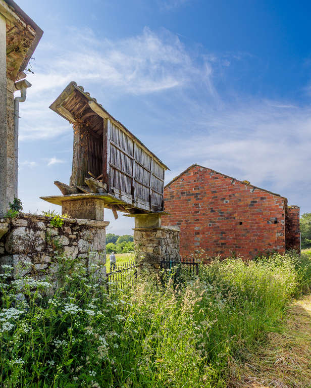 El alpendre-garaje de ladrillo combina zona cerrada y abierta, proporcionando espacio cubierto para vehículos o almacenamiento. El hórreo tradicional gallego, con sus características columnas de piedra, representa un elemento patrimonial de gran valor y sirve de entrada a la finca.