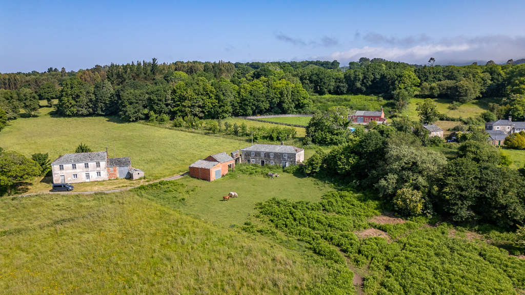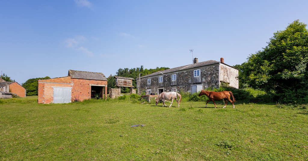 Esta propiedad se encuentra en una pequeña aldea a 11 km de Villalba, en el corazón de la Terra Chá lucense. La finca cuenta con 4117 m² de terreno prácticamente llano que alberga una casa principal de piedra de dos plantas, un alpendre-garaje de ladrillo y un hórreo tradicional gallego.