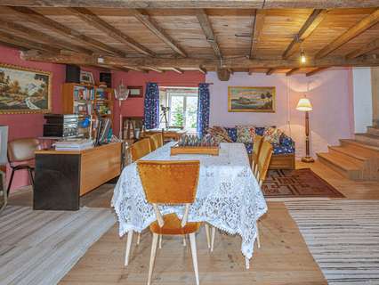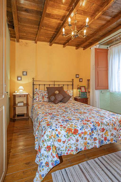 La planta superior dispone de un amplio comedor con vigas de madera vista y chimenea que distribuye hacia dos cuartos de baño completos, dos habitaciones pequeñas y una habitación principal muy amplia. El comedor cuenta con salida a balcón con vistas al paisaje rural.
