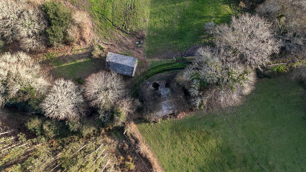 Frente a la casa, al otro lado del camino, se alza una segunda construcción de mayor tamaño, en estado de ruina y cubierta por la vegetación.