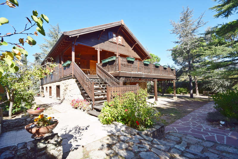 Magnifico chalet individual de pino báltico, estilo casa de los Alpes. Situado en Collado Mediano, lindando con el pueblo de Navacerrada, en una urbanización privada con vigilancia las 24h. Consta de 427m2 construidos (apróx.) distribuido en dos plantas y garaje. En la planta alta podemos encontrar 6 de los 9 dormitorios, todos amplios y con unas preciosas vistas a la montaña; 3 de los 5 cuartos de baño, todos ellos completos; una amplísima cocina y un espectacular salón con una fantástica chimenea y salida a una gran terraza cubierta de unos 31m2 (apróx.) desde donde se puede acceder directamente al jardín. En planta principal se encuentran los otros 3 dormitorios, 2 cuartos de baño y un salón de reuniones muy espacioso con una barra de servicio y un horno, que no solo sirve para asar grandes comidas sino que además calienta como una chimenea. Desde dicho salón se puede salir a un porche muy agradable, a través del cuál accedemos a la zona deportiva de la finca. A través de esta planta principal también se puede acceder al garaje, de unos 60m2 (apróx.) con mucho sitio de almacenaje y donde entran hasta tres coches.