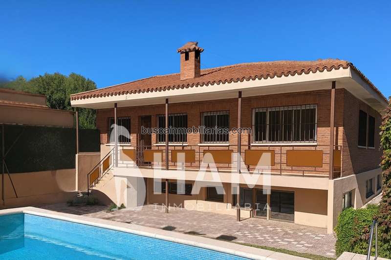Exteriores: Piscina de obra, zona de porche/cenador y jardín consolidado.