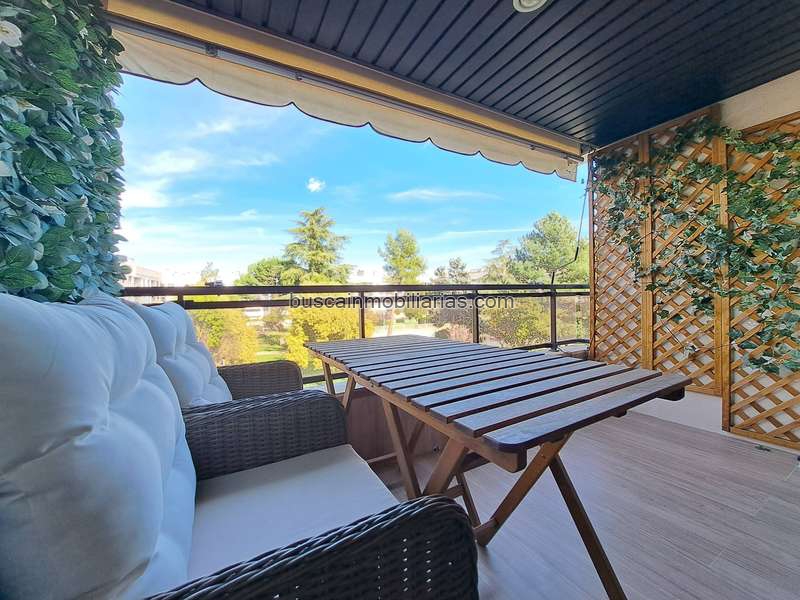 La vivienda de 102 metros consta de un amplio salón-comedor diáfano con salida a una espectacular terraza, cocina office totalmente equipada con tendedero, y 2 dormitorios muy luminosos (el principal en suite con vestidor) y 2 baños completos. Destaca por sus altas calidades: suelo de parquet de madera natural, ventanas Climalit, aire acondicionado y calefacción individual por gas natural. El precio incluye dos amplias plazas de garaje. La urbanización ofrece vigilancia 24 horas, piscina, 2 pistas de pádel, zonas verdes y área infantil. Su ubicación es inmejorable, junto a la estación de tren de Aravaca, acceso rápido a la M-40 y proximidad a centros como El Corte Inglés, CC Zielo y el colegio Santa María de los Rosales.