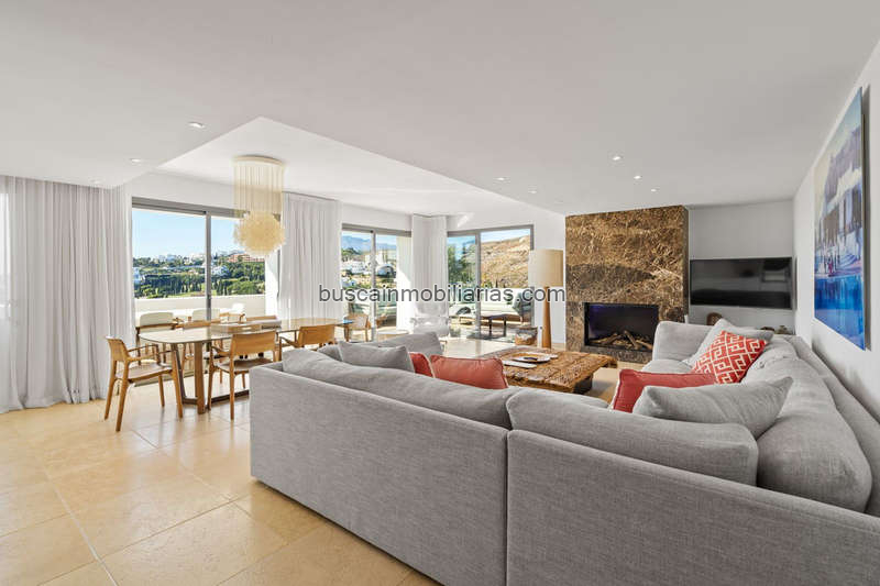 Sal al exterior a la amplia terraza, equipada con un comedor, una zona de descanso, piscina privada y vistas panorámicas impresionantes al mar, las montañas, los campos de golf y la prestigiosa Villa Padierna.