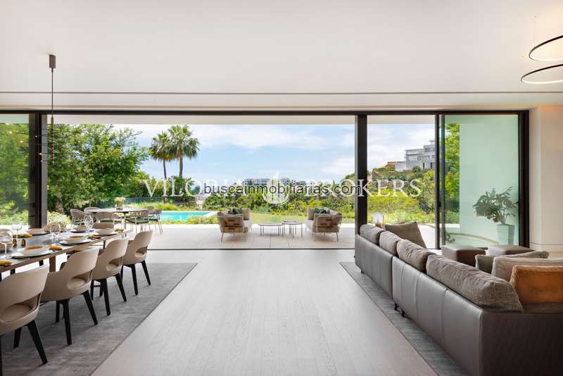 La villa cuenta con un estilo moderno a la hora de diseñar y distribuir sus estancias. La zona de día, está distribuida a lo largo de una espaciosa estancia que da acceso directo a la terraza y el jardín: cocina, comedor y zona de estar todo integrado en la misma área. Además de contar con una cocina a parte, equipada y con acceso de servicio. Esta villa cuenta con 6 lujosos dormitorios en suite, cada uno con diferentes panorámicas al entorno y de esta forma variando su distribución aprovechando la luz y las vistas.