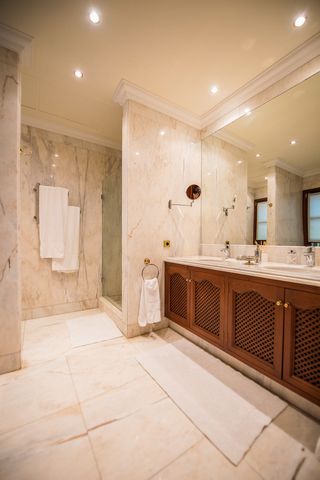 The main house, a splendid Spanish villa, climbs behind the pompous natural stone-built driveway with fountains. Master Bedroom with luxurious marble bathroom and terrace with distant views, 4 further bedrooms with terraces and marble bathrooms and 2 children's rooms with shared bathroom. Spacious living spaces with charming and cosy furnishings completes the Spanish flair.