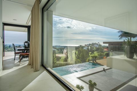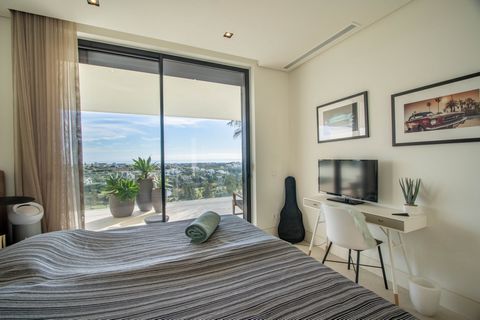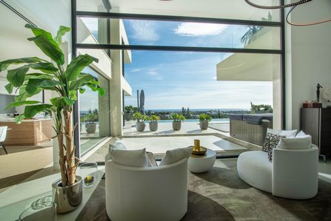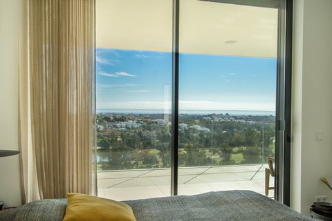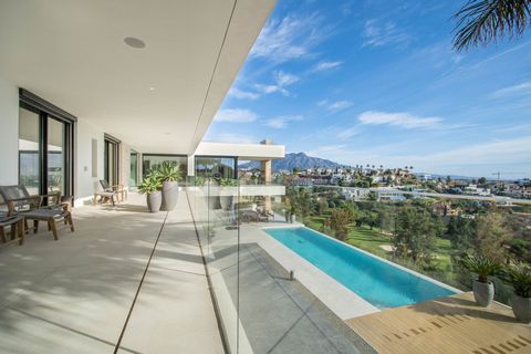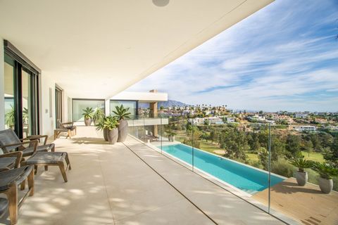 This exceptional contemporary villa offers a seamless fusion of elegance, functionality, and breathtaking views. Perched in a privileged location with commanding panoramic vistas of the sea, mountains, and golf course, the home is a testament to modern architectural sophistication.