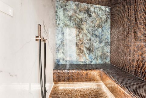 The lower level expands the lifestyle experience with a secondary lounge and kitchenette, a cinema room, a fully equipped gym with steam room and shower, a laundry area, and a wine cellar. Bathrooms are adorned with Gessi fixtures and elegant Italian grand-format porcelain tiles.