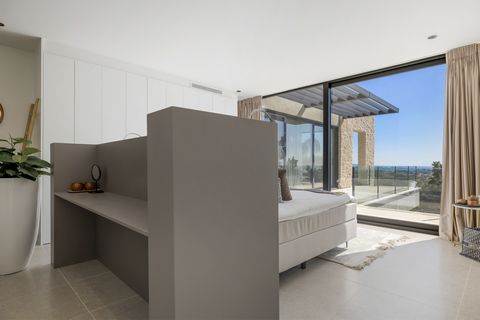 Upstairs, the master suite includes a dressing area and a versatile adjoining room, ideal for use as an office, gym, or additional bedroom. Two further guest bedrooms with en-suite bathrooms are also located on this level. All rooms on the upper floor open to terraces with uninterrupted views. A garage with space for one car is also included. One of the terraces provides access to the rooftop, where solar panels are installed.