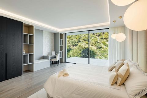 Boasting panoramic views of the Mediterranean Sea, the villa features stunning living spaces with custom-made 7-meter-high windows that allow natural light to flood the interior. The state-of-the-art gourmet kitchen is a true highlight, complemented by a dedicated butler's kitchen and chef’s serving area. For added excitement, a 130-meter water slide winds its way alongside a central glass elevator, blending elegance with fun.
