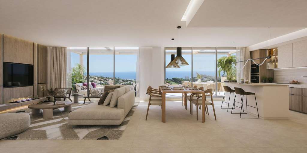 Grandes ventanales y distribuciones diáfanas conectan la vida interior y exterior, dando paso a espectaculares terrazas con impresionantes vistas al Golf Torrequebrada y al Mar Mediterráneo.