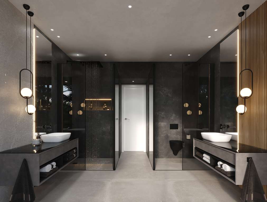 El interior de cada villa está diseñado para ofrecer el máximo confort y lujo. En la planta baja, una cocina de planta abierta conecta sin esfuerzo con la sala de estar, creando un espacio amplio y luminoso que se extiende hacia las terrazas exteriores. La planta superior alberga una suite principal con galería privada, además de tres dormitorios adicionales, todos con baños en suite, garantizando privacidad y espacio para toda la familia. El sótano ofrece un salón múltiple con bar y cine en casa, junto con dormitorios adicionales, todo accesible mediante un ascensor privado. Los acabados interiores incluyen suelos de porcelanato y parquet, sistemas de iluminación LED y calefacción por suelo radiante, garantizando una experiencia de vida sofisticada y confortable.