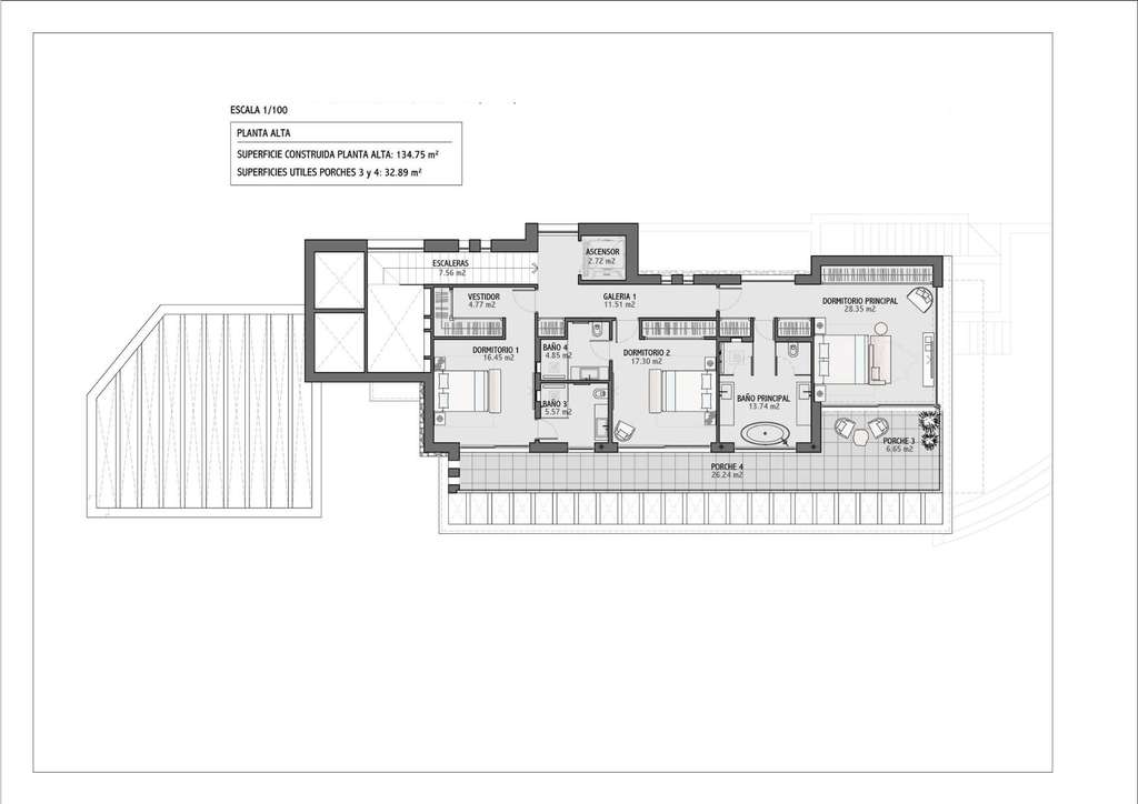 La planta superior cuenta con una suite principal con galería privada, junto con tres dormitorios adicionales, cada uno con baño en suite, proporcionando un amplio espacio para la familia y los invitados.