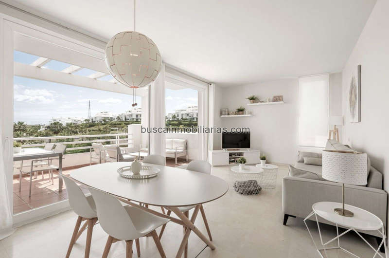El apartamento goza de una orientación sur muy atractiva, con vistas abiertas a los jardines, la piscina y el Mediterráneo. Dispone de dos terrazas: la principal orientada al sur con vistas a las zonas comunes y al mar, y una segunda terraza orientada al norte con vistas a la montaña. En el interior destacan los techos altos y la abundante luz natural. El salón se abre hacia la terraza principal, y la cocina moderna y totalmente equipada se sitúa justo detrás, comunicada mediante una práctica ventana pasaplatos.