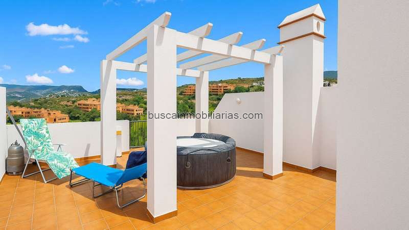 Ático con gran terraza, solárium y jacuzzi — Casares CostaLuminoso ático situado en una zona tranquila de Casares Costa, ideal tanto como vivienda habitual como segunda residencia. La propiedad dispone de aprox. 64 m2 interiores y una gran terraza principal que se conecta mediante escalera con un solárium privado en el nivel superior, sumando un total de 90 m2, ofreciendo un espacio excepcional para tomar el sol, montar una zona chill-out o disfrutar del jacuzzi incluido con total privacidad y vistas abiertas al campo y la montaña.El ático cuenta con 2 dormitorios y 2 baños, suelos de mármol y opción de entregarse amueblado si el comprador lo desea. La cocina es independiente y el edificio dispone de ascensor. El conjunto residencial está completamente vallado, lo que aporta seguridad y tranquilidad.Se incluye una plaza de aparcamiento en garaje comunitario con espacio doble.Ubicación y ventajas:A pocos minutos en coche del mar y de las playas cercanas, la vivienda está muy bien comunicada con Sabinillas, Manilva y el Puerto de La Duquesa, que ofrecen restaurantes, bares, paseo marítimo, servicios y oferta de ocio. Además, hay numerosos campos de golf en la zona y buenas conexiones por la A-7 hacia Estepona (10–12 min) y Marbella (unos 30 min). Los aeropuertos de Gibraltar y Málaga quedan a aproximadamente 35–45 min y