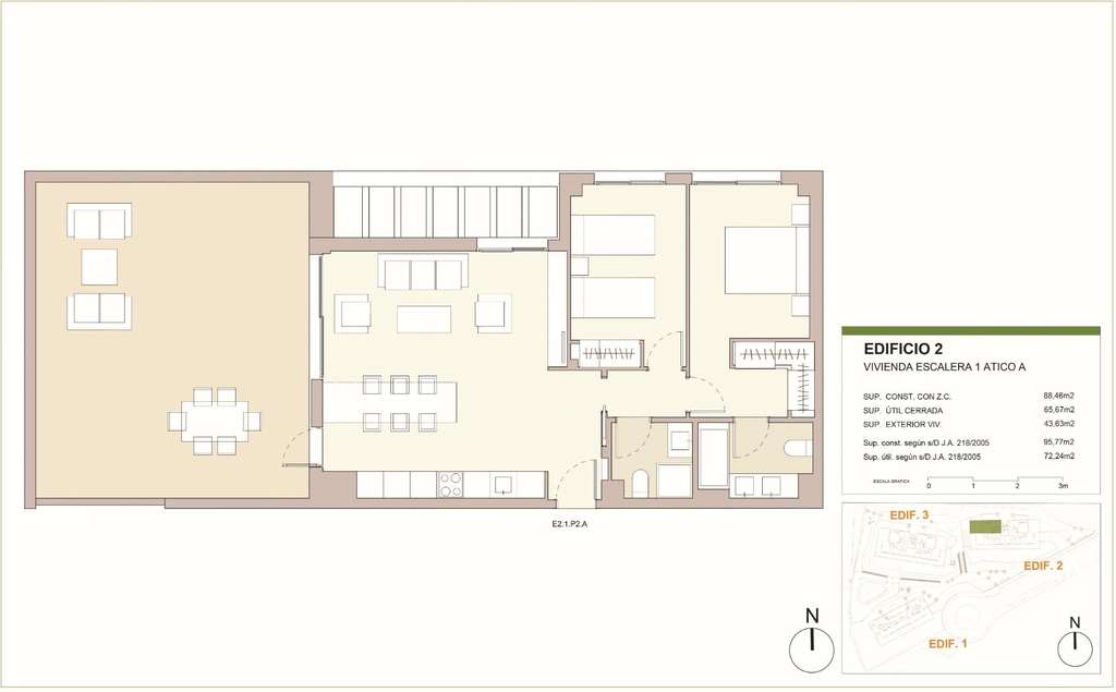 Conjunto residencial de obra nueva en Casares compuesto por 47 viviendas plurifamiliares y áticos de 1, 2 y 3 dormitorios. Cada vivienda dispone de garaje y trastero incluidos.
