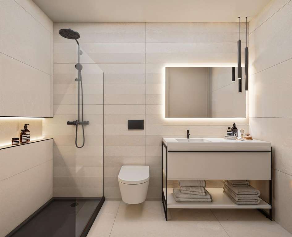 Los dormitorios han sido diseñados como refugios tranquilos, con tonos suaves, espacios generosos y abundante luz natural. Los baños en suite cuentan con accesorios contemporáneos, azulejos de porcelana de altura completa, zonas de ducha minimalistas con mamparas de cristal, lavabos integrados en la encimera, muebles de baño y espejos retroiluminados.