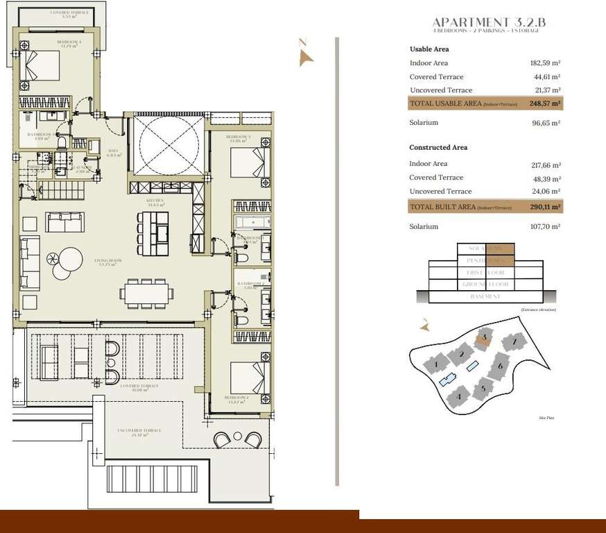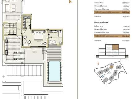 La urbanización consta de siete elegantes edificios de tres plantas cada uno, cuidadosamente situados para aprovechar al máximo las vistas al mar y la luz natural. Los apartamentos están disponibles en configuraciones de 2, 3 y 4 dormitorios, con interiores bellamente elaborados y acabados de alta calidad. Los apartamentos de la planta baja cuentan con amplios jardines privados, mientras que los áticos disponen de solárium y piscina privados. Todos los apartamentos cuentan con modernas cocinas Modulnova, que ofrecen una mezcla de estilo y funcionalidad.