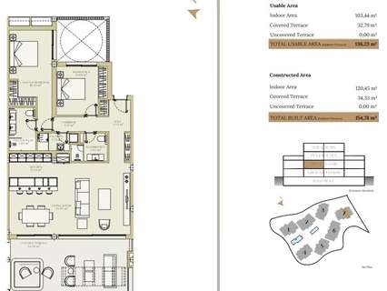 La urbanización consta de siete elegantes edificios de tres plantas cada uno, cuidadosamente situados para aprovechar al máximo las vistas al mar y la luz natural. Los apartamentos están disponibles en configuraciones de 2, 3 y 4 dormitorios, con interiores bellamente elaborados y acabados de alta calidad. Los apartamentos de la planta baja cuentan con amplios jardines privados, mientras que los áticos disponen de solárium y piscina privados. Todos los apartamentos cuentan con modernas cocinas Modulnova, que ofrecen una mezcla de estilo y funcionalidad.