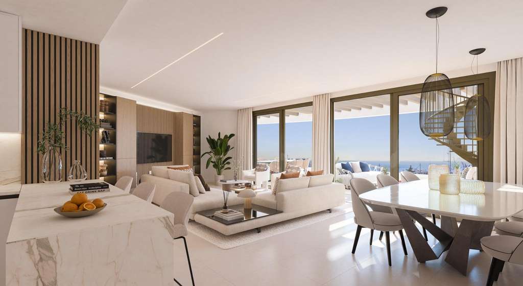 Todos los apartamentos están diseñados con distribuciones diáfanas que maximizan la luz natural y la continuidad entre el interior y el exterior. Los grandes ventanales conectan los salones, las cocinas y los dormitorios con amplias terrazas, creando una fluidez visual hacia el mar y las montañas. Los interiores cuentan con suelos de porcelana, cocinas modernas con electrodomésticos integrados, aire acondicionado por conductos y acabados de alta calidad en todas las estancias. La ventilación cruzada es posible gracias a un diseño transversal inteligente, que garantiza aire fresco y comodidad durante todo el año.